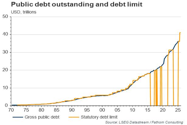 Last week’s News in Charts discussed the compromise agreement to delay most of the spending cuts and tax hikes that have become known as the fiscal cliff. In this week’s edition, we review the next steps. In particular, we focus on upcoming negotiations over the statutory debt limit, which will need to be raised soon. In the end, we expect developments to play out in similar style to those seen during the fiscal cliff negotiations. In other words, we expect a last minute deal that does not resolve the underlying problem, but at least avoids short-term catastrophe. Nevertheless, there is the risk of significant market volatility, especially if negotiations are particularly combative or protracted.