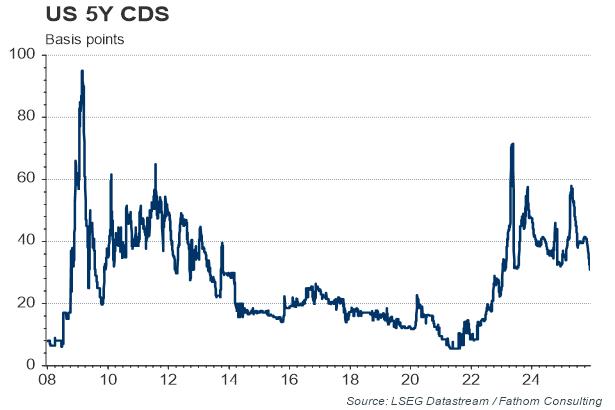 On balance, we attach very little weight to a scenario in which politicians refuse to raise the debt ceiling. Investors appear to agree. While the cost of insuring against a default by the US government has risen slightly in recent days, it remains at an extremely low level. At just over 40bps, its price is broadly in line with its average since the recovery began in June 2009. This suggests that investors in Treasuries remain relaxed about the prospect of a hard US default.