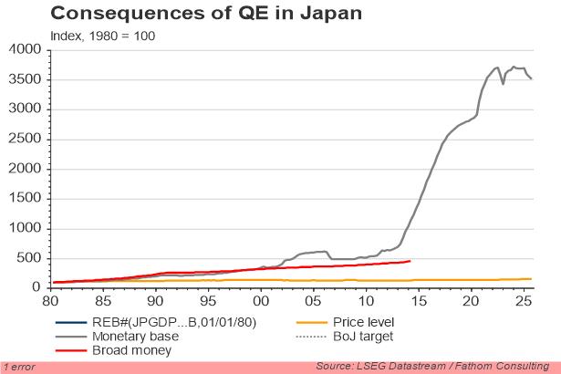 Meanwhile, Japanese equities have soared. In own-currency terms, the Nikkei is up more than 50% since mid-November, and has gained almost 30% since the turn of the year. In dollar terms the gains are halved, but remain impressive nonetheless. According to Fathom’s Global Economic Strategic Allocation Model (GESAM), the magnitude of the asset purchases announced by the Bank of Japan should give a temporary boost to equity prices, but only of the order of 15%. Does this mean the improvement in Japanese equity prices is overdone? The answer to this question depends crucially on whether the rapid expansion of the monetary base has sustained consequences for the real economy. As our chart below shows, QE as practised in Japan since the mid-1990s had next to no effect on either nominal quantities, other than the monetary base, or on the real economy. The hope this time is that the pace of QE, with the monetary base set to double in two years rather than ten, will make a difference. We doubt it, and on that basis we are taking a short position in Japanese equities. Even if the policy is successful in bringing deflation to an end, and pushing inflation close to 2%, the risk is that nominal wages fail to respond. A recent poll by Thomson Reuters found that 85% of Japanese firms planned either to freeze wages this year, or to cut them.