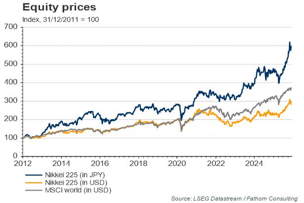 Financial markets continue to react much more to central bank talk than to economic data. Nowhere is this more true than in Japan, where financial markets have responded with unbridled enthusiasm to Prime Minister Shinzo Abe, and his ambitious plans for economic reform, which include an increase in the inflation target from 1% to 2%, implying the need for a further loosening of monetary policy. Earlier this month the Bank of Japan, under its new Governor Haruhiko Kuroda, answered his challenge by setting out proposals for a doubling of the monetary base in just two years. If enacted in full, the policy would involve the Bank of Japan purchasing more than the entire net issuance of JGBs over that period. In response, the Yen has continued its inexorable slide, and at the time of writing was just shy of the psychologically-important benchmark of 100 again the US dollar.
