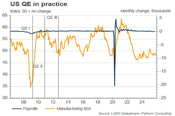 Our judgment is that, while fiscal consolidation will weigh down on US growth this year, it will not derail the recovery. If the slowdown becomes entrenched, the Fed will respond by stepping up the existing QE programme. As our chart above shows, policy makers have previously reacted very quickly in this respect. In spite of the Minutes of the March FOMC meeting, which took place before members had seen either the survey data, or the labour market data for March, we do not believe this time will be any different.