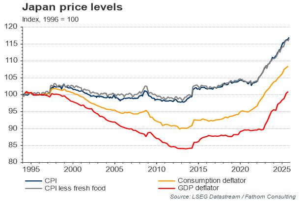 Japan has been stuck with stagnant or falling prices for around two decades, and one of the main policies of Abenomics is to hit a 2% inflation target. However, our chart illustrates how the broader GDP deflator measure of prices points to a far more severe decline of the order of 18% compared to a more modest decline in the CPI of around 3%.