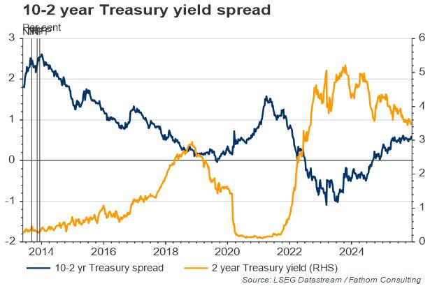 So far, the combination of a steepening yield curve with falling short-term Treasury yields suggests that markets have taken the Fed’s guidance on board. Investors appear to have “moved on”, more or less fully discounting the initiation of tapering: the 10-year Treasury yield shrugged off November’s strong employment report and US equities have broken to record highs despite relatively weak corporate earnings expansion.