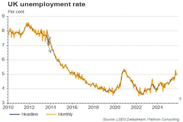 The single month unemployment rate for November was 7.4%, 0.6 percentage points lower than the corresponding figure for August. The single-month unemployment rate for October was 7.0%, 0.7 percentage points lower than the corresponding figure for July. If we assume that the declines seen over these two three-month periods are representative of the underlying trend in unemployment, it would point to a single-month figure of 6.5% in December. That in turn would put the headline rate at 6.9%. Consequently, we see a better-than-evens chance that, when next month’s Labour Market Statistics release is published on 19th February, it will be evident that the headline unemployment rate breached the MPC’s threshold during the final quarter of last year.