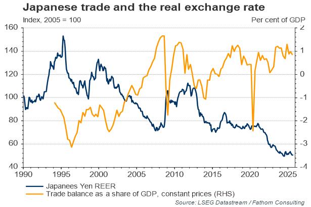 At the same time, net exports have failed to provide a buffer. Japan’s current account shortfall hit a record ¥1,589.0 billion in January, driven by a widening trade deficit. While the J-curve effect from the depreciating yen is partly to blame, this is likely not telling the whole story. By looking at the constant price trade balance, rather than the current price current account balance, one can essentially strip out the J-curve effect. Historically, there has been a reasonably close inverse relationship between the real effective exchange rate and the trade balance as a share of GDP, in line with economic theory, as our first chart illustrates. Japan’s trade balance improved steadily over the 2000-2008 period as the currency fell. Looking through the dip – a consequence of the collapse in world trade that occurred alongside the financial crisis – it then deteriorated steadily post 2008 as the yen appreciated. The all-important question now is whether the old pattern will reassert itself. There is no evidence yet, after stripping out price effects, that the trade balance is starting to improve; but might it be about to turn a corner?