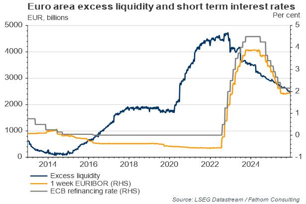 Short-term market interest rates have been increasing for a few months now against a backdrop of unchanged policy. This is primarily a consequence of the fact that excess liquidity has fallen to as low as €80 billion –Mr Draghi said last year that something around €200 billion was the expected level – as banks have made efforts to repay their LTROs early, and are hoarding liquidity ahead of the stress tests results and AQR.