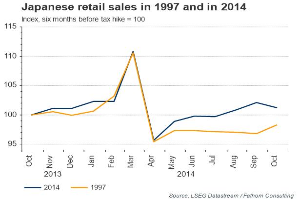 Because we assume no offsetting policy changes – such as cuts in other forms of taxation, or an expansion of the QQE programme – the simulation set out in our chart is very much a worst-case scenario. And it should be stressed that it shows a projection for the level of GDP relative to a counterfactual world where the sales tax did not change. If we imagine that the economy might have expanded at close to its trend rate of growth (of around 0.5% a year) had the sales tax remained at 5%, then we find that it would take just over three years for the level of GDP to recover to its level before the sales tax rise. That is close to the amount of time that it took back in 1997. Evidence from our model, then, suggests that it was the sales tax rise rather than the Asian Crisis that did most of the damage back in 1997.