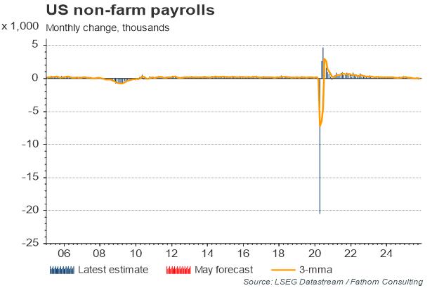 Moreover, the trend in payrolls remains encouraging. The average of the monthly change in payrolls for the first four months of 2014 stands at 214k, 20K above the average for last year as a whole. As Fed policymakers noted at their last meeting, conditions in the labour market continued to mend and ‘participants generally expected further gradual improvement.’ Our statistical model, based on the weekly claims data, suggests that non-farm payrolls rose by 245K in May, 30K above the consensus. This rather strong bounce-back is driven by a reduction in the number of Americans that filed applications for unemployment benefits in May – the four-week average was at its lowest level since August 2007.