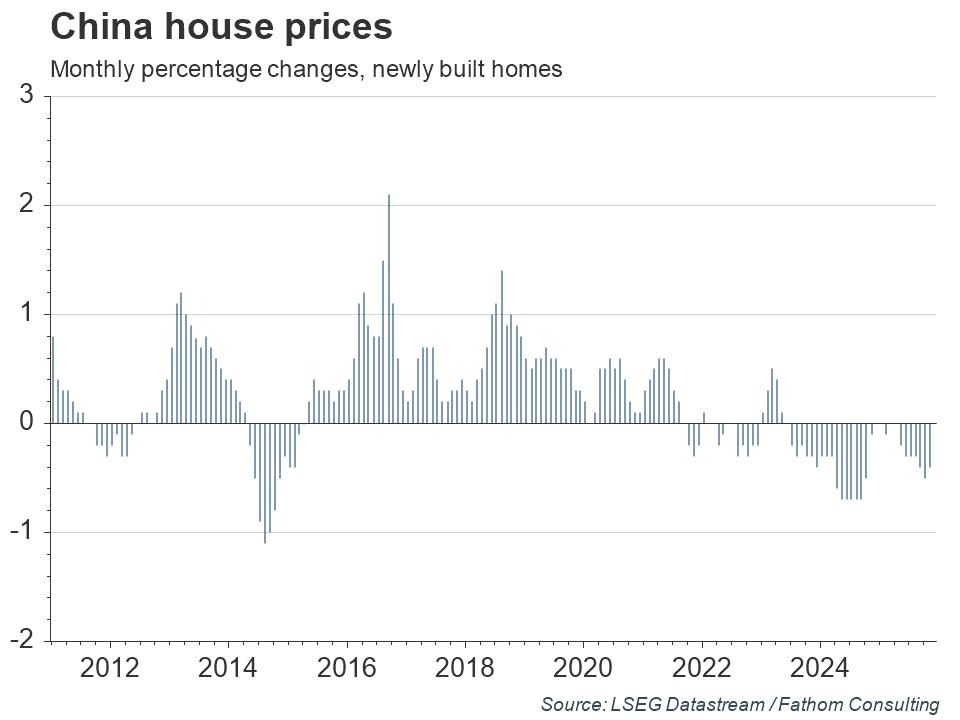China’s multi-year housing boom has ended. Commercial sales fell by 8.2% from a year earlier in the first seven months of the year – a significant drop from the high rates of growth seen in the first two months of the year. The price of new homes in China fell by 0.9% – the largest monthly fall in this comparatively new measure of property prices. Prices are weak across the country – 64 out of the 70 cities covered by the survey saw prices fall in July.