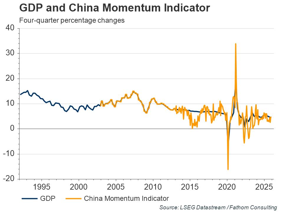 Before he became Premier, it was leaked that Li Keqiang had said he had little faith in China’s official GDP figures. He preferred instead to look at electricity consumption, at rail freight volumes and at credit growth. At Fathom, we have constructed our own China Momentum Indicator (CMI), using these variables, and estimating the appropriate weights and seasonal factors. As our chart shows, the CMI has on occasion led the official statistics, while at other times it has been coincident.