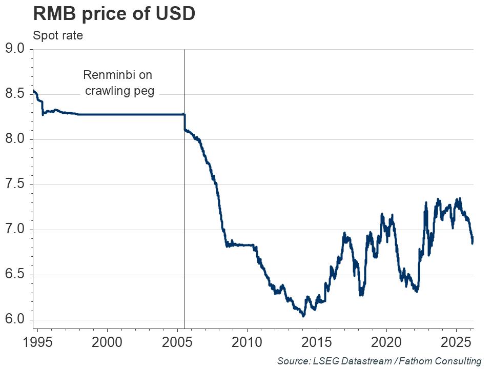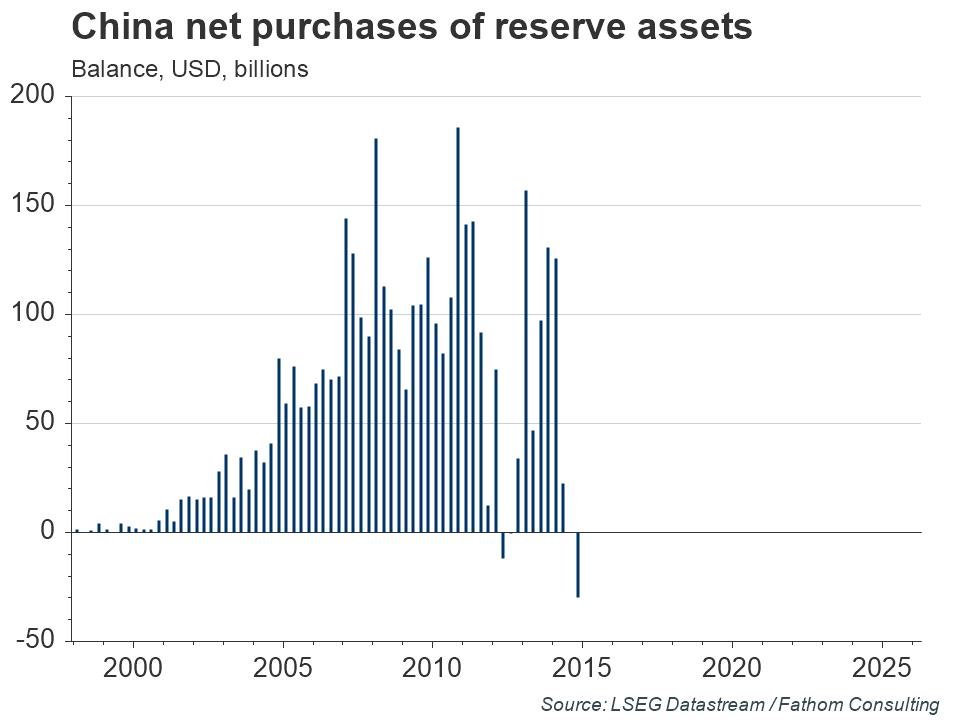 Since joining the WTO in 2001, China has run a series of large and persistent current account surpluses. That much is well known. At the same time, it has tended to attract net inflows of capital as global investors have sought greater exposure to what was rapidly becoming the world’s largest economy. In order to prevent a substantial appreciation of the RMB, the PBOC built up large quantities of foreign exchange reserves, as our third chart shows. During the final quarter of last year, however, these flows went into reverse. The PBoC made the largest net sale of official reserves since at least the late 1990s, when these data were first collected. For now, China’s authorities are leaning against some of the downward pressure on the RMB, though not by enough to keep the currency stable. It is worth noting that, at current levels of intervention, the currency has been falling at an annual pace of more than 5% since October. According to US Treasury Undersecretary for International Affairs, Nathan Sheets, in bilateral talks held during the summer, China committed to reduce foreign exchange market intervention. ‘By our reading, China has essentially refrained from foreign exchange purchases since that period,’ he said earlier this month. Quite. Far from purchasing foreign exchange, they appear to be conducting large-scale sales in order to stem the decline in the RMB.