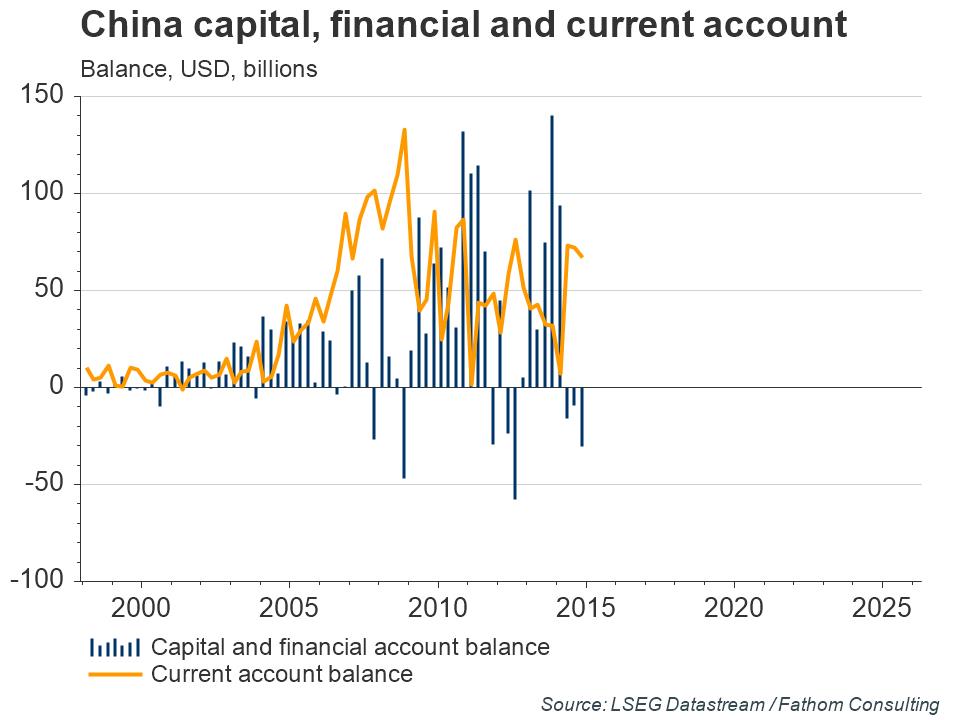 The renminbi has fallen in value against the dollar by almost 1% since the beginning of this year, and by just over 2% since October. Small moves, perhaps, but they go against a trend that had been in place for the best part of ten years. The depreciation of the RMB since the autumn has been accompanied by a significant net withdrawal of funds from China. The deficit on the capital and financial accounts through Q4, at $91.2 billion, was the largest on record, as our second chart shows. In our view, this has been driven by falling sentiment regarding China’s economy, the prospect of further interest rate cuts, and a growing expectation that the RMB will be allowed to fall – perhaps significantly.