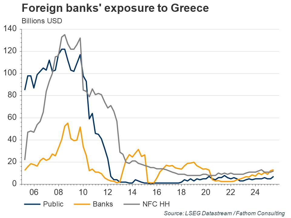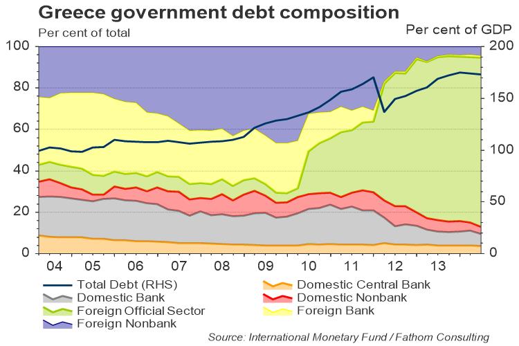 We view this equanimity as both surprising and dangerous for several reasons. Firstly, as confirmed by BIS data, Greece owes much of its debt to the foreign official sector. In the event of a default, creditors would hope to get at least some of their money back. But in the event of Grexit, any repayment is highly unlikely. This could prove troublesome to the likes of Spain and Italy.