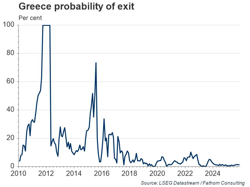 Without access to emergency funds, Greece will be rendered bankrupt. And, while not our central scenario, it is conceivable that this could lead to Greece’s exit from the euro area. Indeed, according to Fathom’s Probability of Exit metric, markets now ascribe a 100% probability to Grexit.