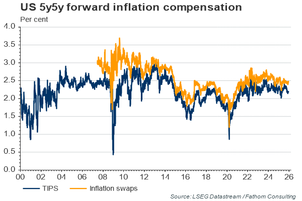 The longer that China’s economy remains in the doldrums – China’s true rate of growth is a long way south of the official data – the greater the chance that Beijing decides to throw in the towel on rebalancing. Indeed, our central view is now that it does precisely this, seeking to stimulate growth largely through a combination of increased investment and increased public spending, much as it did through 2008 and into 2009. In this environment, we would see some upward pressure on commodities prices, and by extension, on non-core components of CPI inflation around the world. If we are right, then US inflation breakevens are too low and present a buying opportunity.