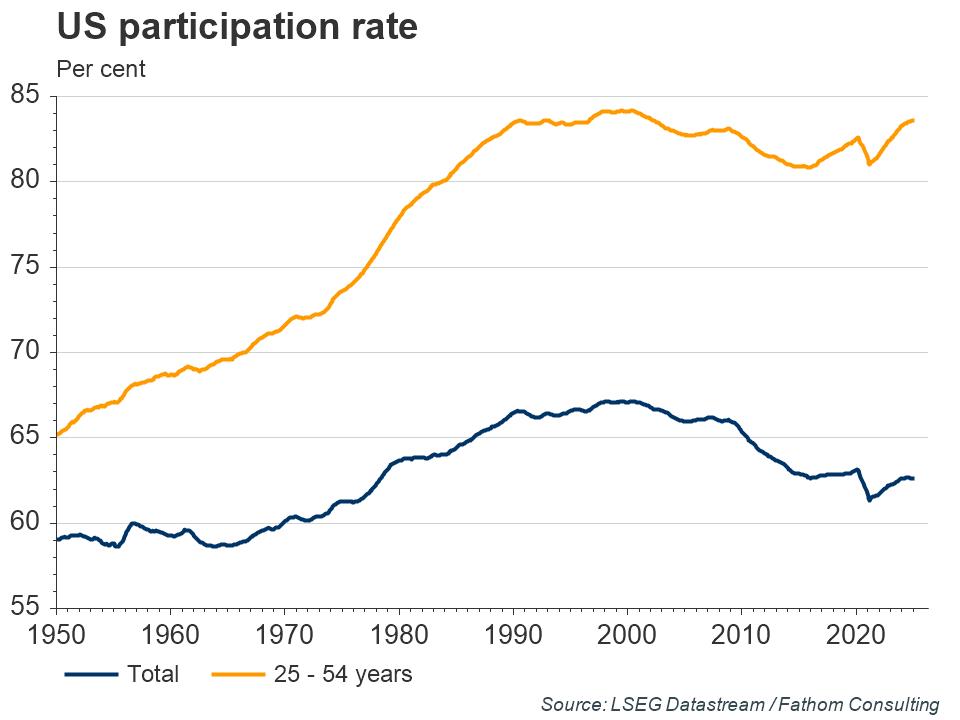 But federal funds futures prices seem to be implying that the US economy is heading into a recession. We disagree. In fact, we still believe that the domestic economy is relatively strong and that the labour market is close to full employment. Indeed, although US labour market participation has fallen, we estimate that around two thirds of the decline since 2008 is due to demographics and the ageing of the US workforce.