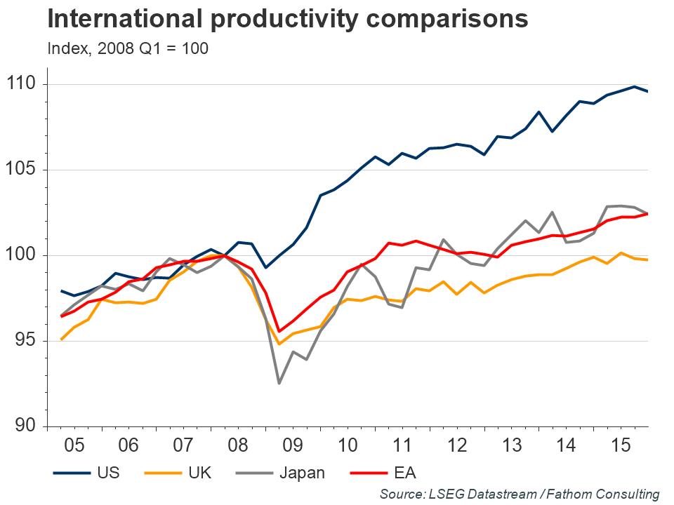 Alone among those economies that suffered a severe banking crisis through 2008 and into 2009, the US moved swiftly to recapitalise its own deposit-taking institutions. That was progress indeed. It is why US banks are lending again, and it is why, in productivity terms, the US has outperformed more or less every major economy since the Great Recession came to an end. Although in relative terms the US has had a good recovery, in absolute terms it has not. Our second chart shows that US productivity growth tends to move in long cycles of booms and busts. Whether we look over the past five years, or whether we look over the past ten years, US productivity growth is close to as weak as it has ever been.