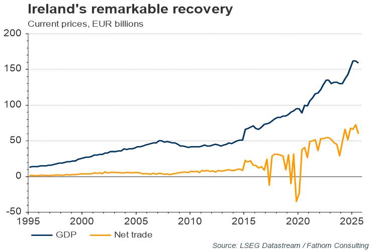 The EU’s rules and regulations for the compilation of statistical data are enshrined in the European System of Accounts (ESA) 2010. ESA 2010 brought with it a number of important conceptual changes, not least of which was to the measurement of international trade. Previously, to be recorded either as an import or an export, a manufactured product had to cross an international border. Not so under ESA 2010. Instead, there merely needs to be a change of ownership. Imagine that a large computer manufacturer, with production sites across the US, moves its headquarters, for tax purposes, to Ireland. All raw materials purchased will now count as an import into Ireland, and all finished goods sold will count as an export from Ireland. This is true even though all economic activity continues to take place in the US, with not so much as a single silicon chip touching Irish soil. Moreover, to the extent that the production process adds value, exports will tend to exceed imports, boosting Ireland’s trade balance in an entirely meaningless way.