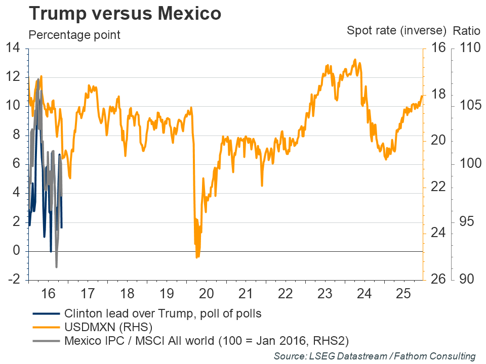 Mexico’s IPC stock index has been among the world’s best performing equity indices this month, up around 3% in local currency and 7% in US dollars. The Mexican peso has also been one of the world’s best performing currencies in August. A risk-on mood among investors, higher commodity prices and a rally in emerging market assets more generally have helped. But Mexico has outperformed most other emerging markets and the reason for this seems to be the diminishing prospects of Donald Trump becoming the next US president!