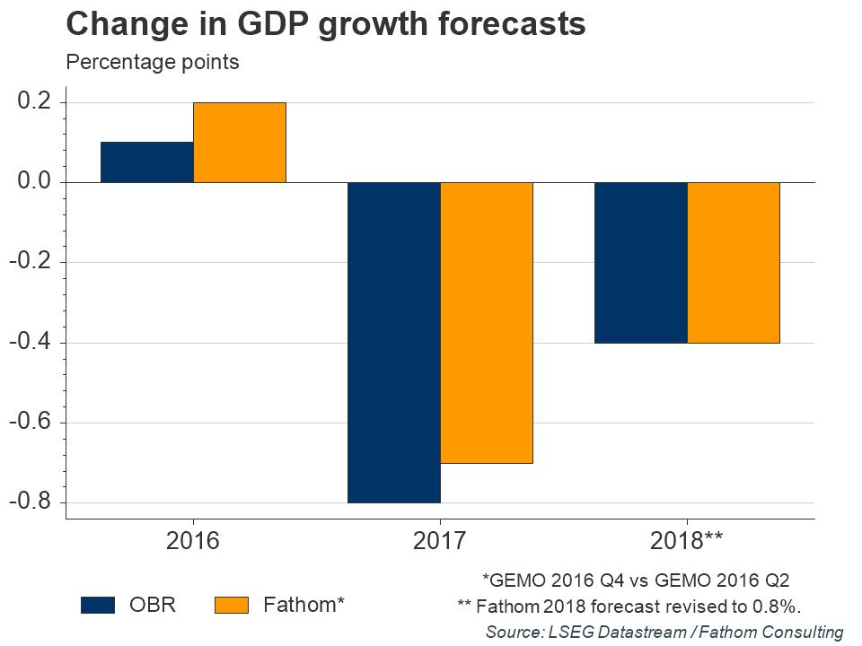 The main difference between our own forecasts, and those of both the OBR and the consensus, is likely to be in our different judgments about trend growth. Fathom’s view is that dismal productivity growth post-crisis means that trend economic growth is somewhere in the range 1.0%-1.5%. Uncertainty associated with the Brexit vote, combined with the fact that the UK has experienced several years of above trend growth, leads us to expect growth to be materially below trend next year.