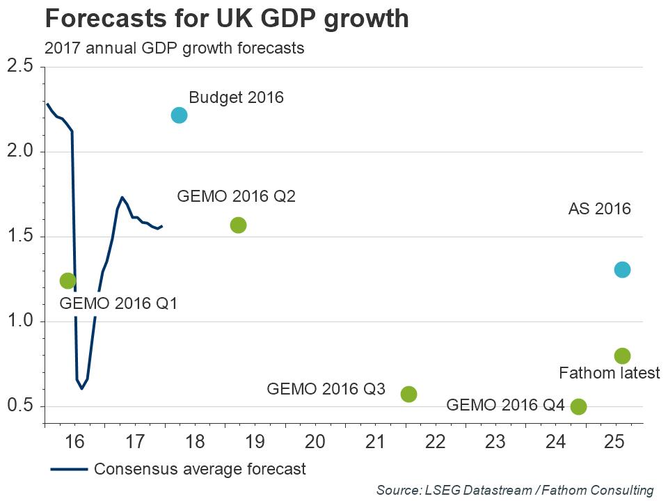 We have revised our forecast for the final quarter of 2016 from a mild negative to a small positive, but expect growth to be slower further out in 2017. Our assessment of the amount of time that business investment takes to respond to a negative demand shock suggests that the largest impact on business investment is felt two to three quarters after the event. Largely, we expect the low rates of productivity growth in evidence since 2008/09 to persist. Consequently, we now expect UK GDP growth to be a little under 1.0% next year. That is still a little below the consensus forecast of 1.1%, and some way below the OBR’s forecast of 1.4%.