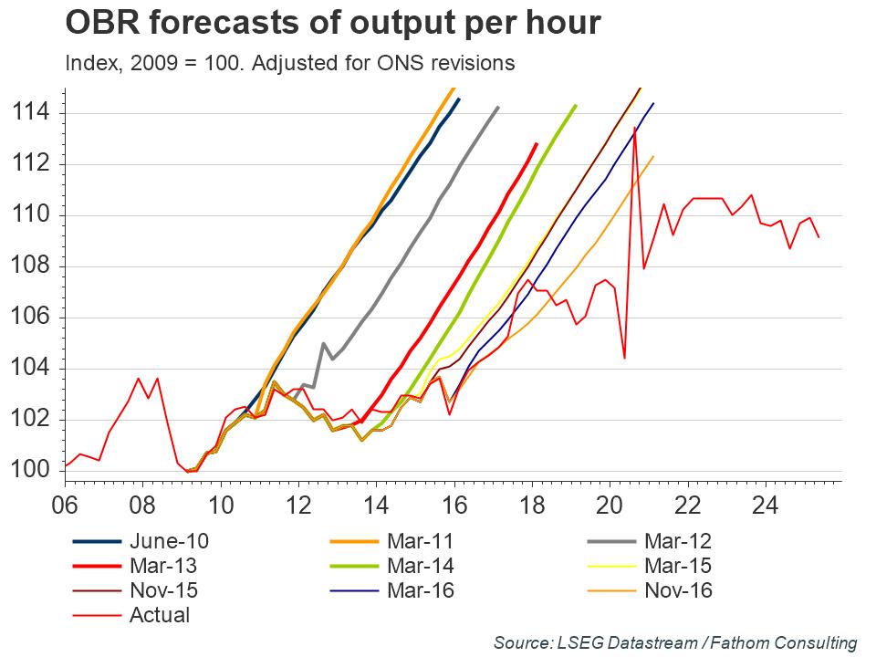 Philip Hammond announced the creation of a National Productivity Investment Fund designed to boost productivity, rightly seen as the UK’s Achilles Heel. And yet the OBR has revised down its forecast for productivity growth in the near term, and made no change further out. Even these new forecasts are too optimistic in our view.