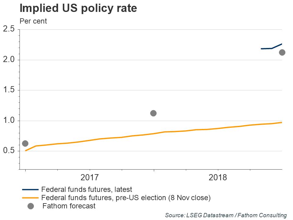 Donald Trump’s victory in last month’s US presidential election has prompted investors to recalibrate their expectations for US monetary policy. A significantly quicker pace of tightening is now implied by fed funds futures than on 8 November, as investors bet that Mr Trump’s fiscal stimulus will push US inflation higher. We think investors are right to assume a faster pace of tightening than we have seen in the past year. However, it remains to be seen how much of Mr Trump’s planned stimulus will get approved by Congress and when it will take effect. In our view, the impact of this stimulus is unlikely to be seen before the second half of next year, at a time when the US labour market will be running above its potential.