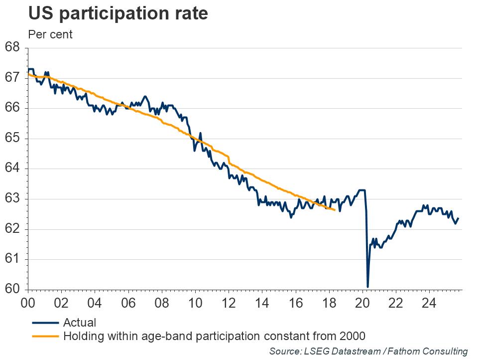 Last year we estimated that the breakeven rate of payroll growth was 60,000 per month, a level that appears to be a lot lower than generally perceived. We also observed that most of the decline in the labour market participation rate in recent years is structural, not cyclical.