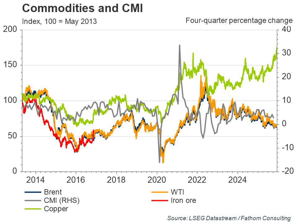 In our Global Economic and Markets Outlook for 2016 Q2 we said “if the CMI (Fathom’s proprietary China Momentum Indicator) is set to turn, expect to see stronger commodities prices, particularly metals and therefore… a resurgent China is good for commodities exporters, and will provide a much-needed boost to non-core inflation around the world.” The price of Brent crude oil rose by around 50% last year alongside a pick-up in the CMI.