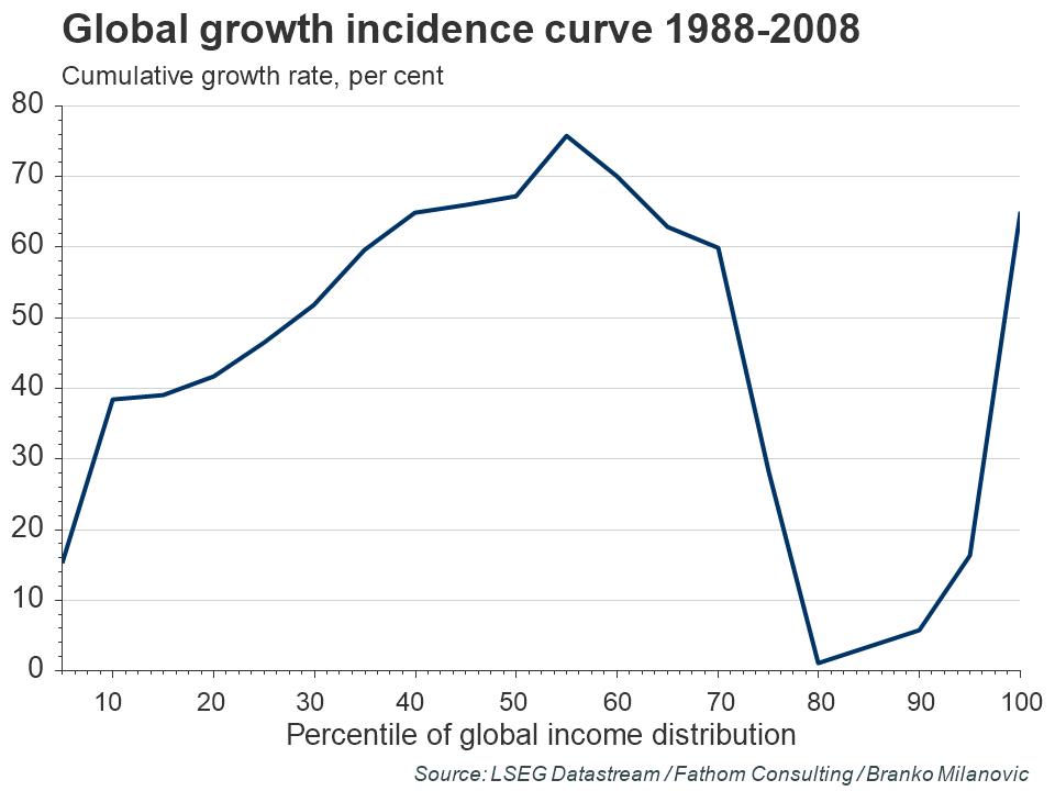 Rising threat of global isolationism. Fathom was early in drawing attention to the underlying economic drivers of the disaffection with globalisation in developed economies – citing the famous chart of global income growth by income percentile initiated by Branco Milanovic: the chart of 2016.