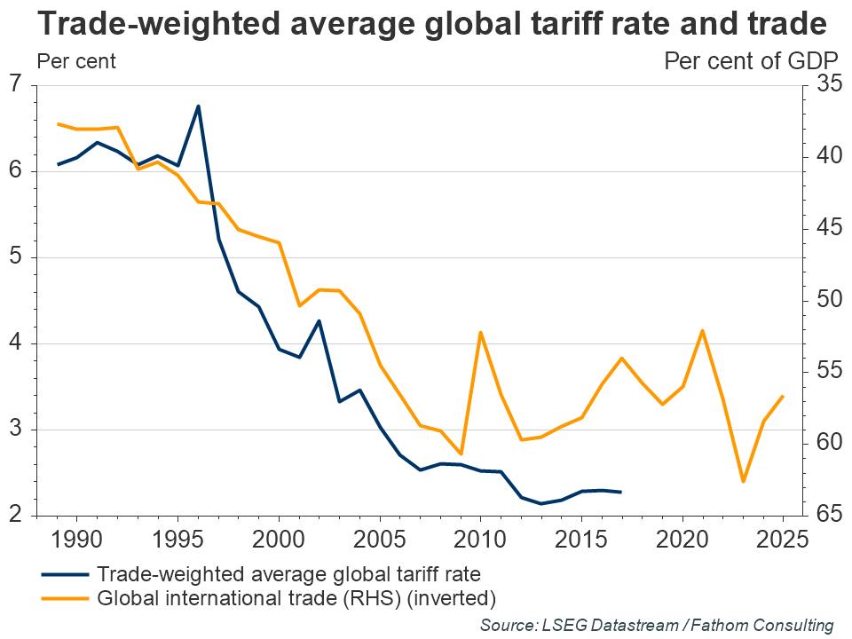 Looking ahead, the outlook for the global economy hinges to a great extent on the turning of the political tide. Indeed, if that process continues unabated through 2017, we will be in a very different world, politically and economically, by the end of the year. If other countries swell the rising tide of isolationism and protectionism, it will be profoundly damaging for global growth, through a reduction in global trade via tariffs and other barriers (as the chart illustrates), and a corresponding reduction in the gains from comparative advantage. But if that tide has already reached its flood, and starts to ebb in coming months, then it will be closer to business as usual, with some important nuances and wrinkles around that, including a decisive ‘decoupling’ between the US and other developed economies – to be discussed in our forthcoming Global Economic and Markets Outlook.