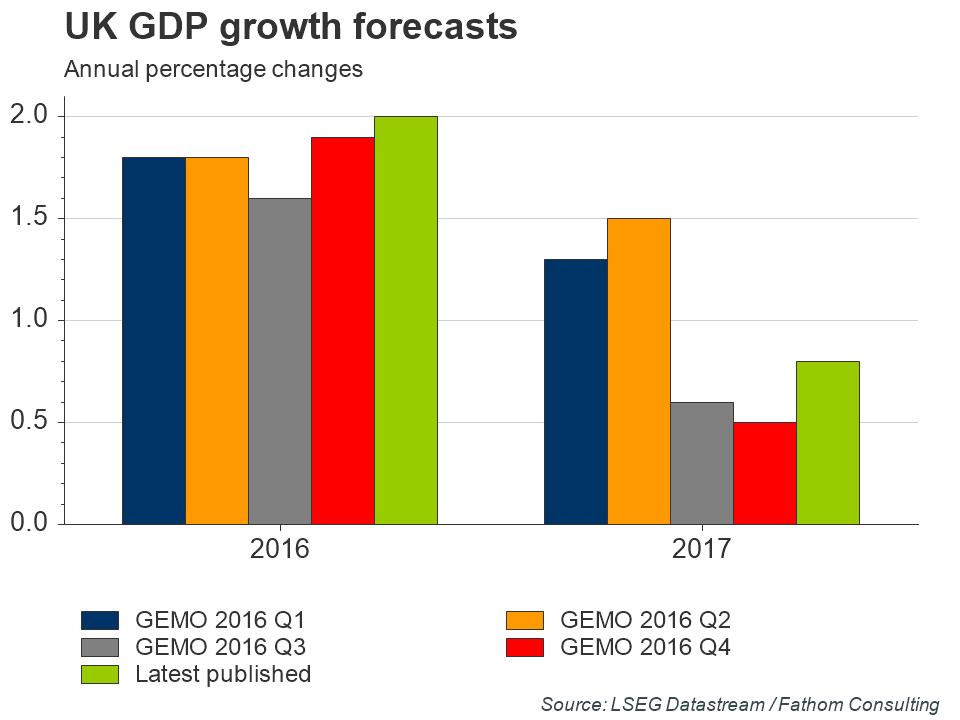 But the UK’s surprise vote to leave the EU in June caused us to revise down our forecasts for growth in both years. Since then, data has surprised on the upside – business surveys rebounded after their initial collapse and even early business investment data were surprisingly buoyant. This led us to shift our growth forecast back up, at least part of the way. Our current view is that the negative impact of Brexit, specifically via investment, is still to come – we will explain why in our forthcoming Global Economic and Markets Outlook.