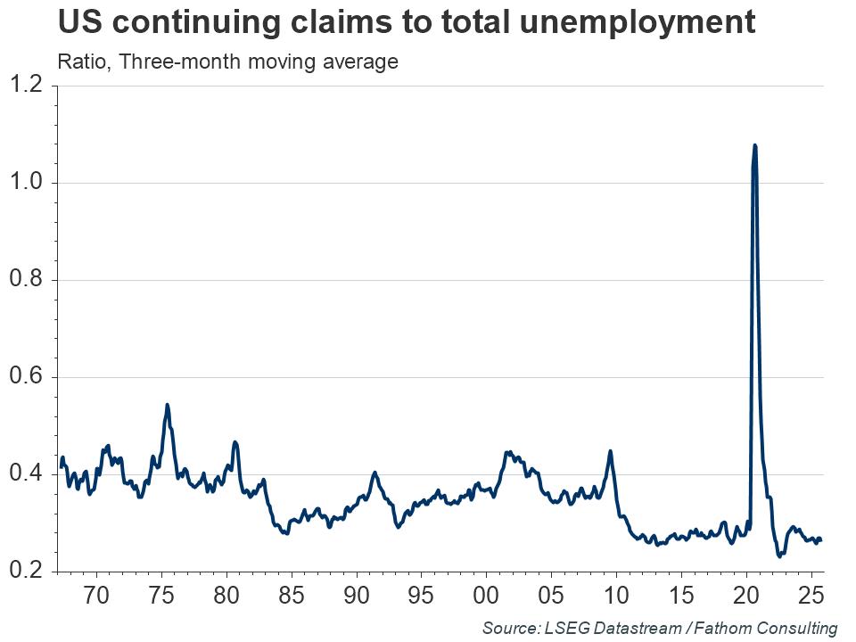 US unemployment insurance is capped at 26 weeks and with long-term unemployment still elevated, the unemployment benefits of many have simply expired. This might explain why the ratio of continuing claims to total unemployment is close to the lowest on record, as highlighted by the chart below.