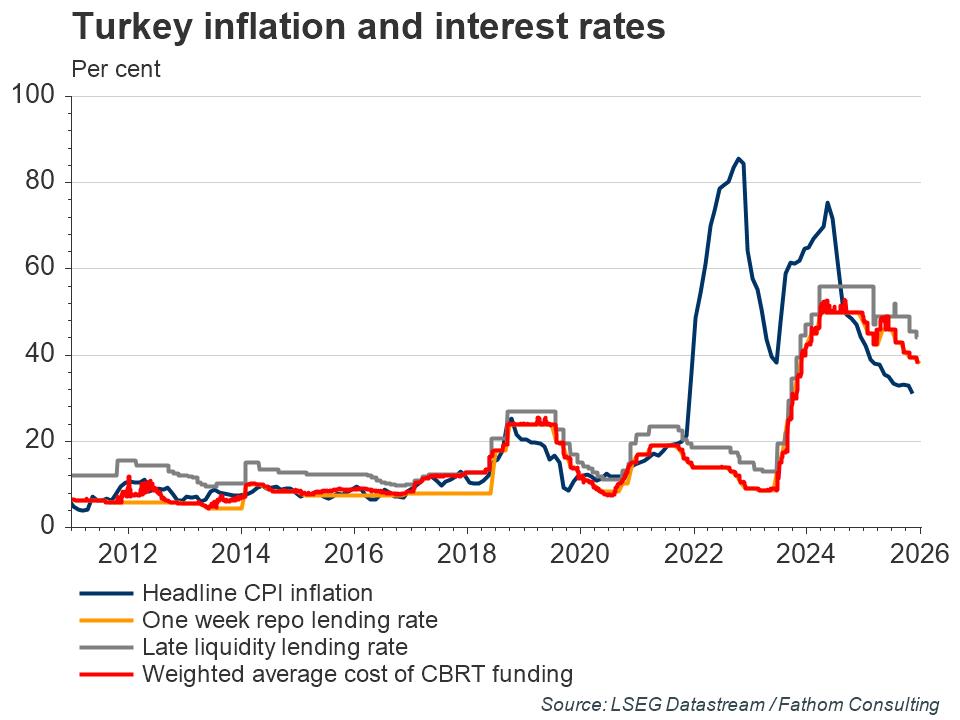 With inflation more than double the 5% target, Turkey’s central bank left its headline policy rate on hold at 8% last week. Instead, policymakers opted to increase the late liquidity lending rate by 50 basis points to 12.25%. The Bank has decided against hikes in the one week repo lending rate in recent months, instead utilising its interest rate corridor to increase banks’ average funding costs. So while the one-week repo rate has been on hold all of 2017, the weighted average cost of central bank funding has increased from 8.3% to 11.8%.