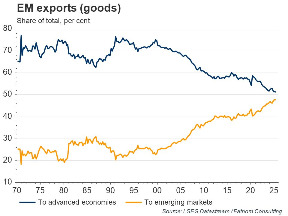 Emerging economies have continued to drive world GDP growth in recent years, but have nonetheless been a drag on the world trade ratio. The share of total EM exports and imports in world GDP has declined from a peak of 19.4% in 2013 to 16.1% last year. That is less severe than the equivalent 33.5% to 26.4% drop experienced by the advanced economies, but it still marks a substantial shift from the fast-rising pre-crisis trend. After staying in a 20% to 30% range from 1970 to 2000, intra-emerging market exports, as a share of total emerging market exports, jumped from 24% in 2000 to 40% in 2012. However, as the second chart below shows, that ratio has flatlined over the past few years.