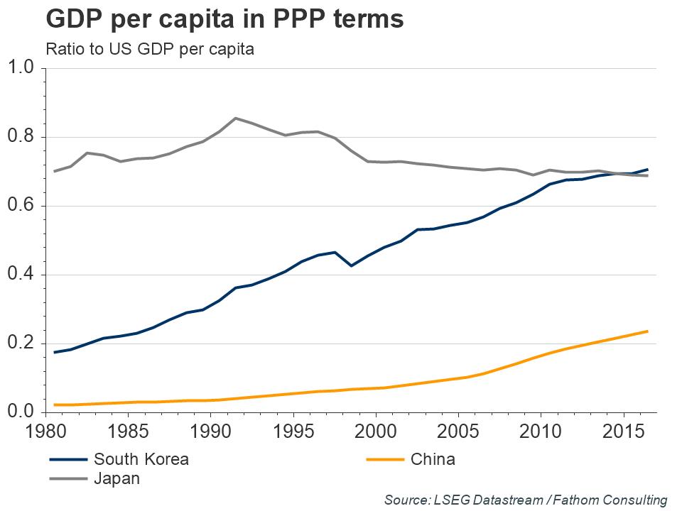 Today, South Korea’s economy is almost ten times the size it was in 1980. Labelled one of the star performers of the global economy during this time, it moved up the World Bank’s income-classification ladder to achieve ‘high-income’ status by 1995, joining advanced economies such as the US and Japan. In 2016, South Korea’s GDP per capita, measured in purchasing-power-parity terms, was just shy of Japan and 75% of that of the US. On this metric, South Korea escaped the middle-income trap (MIT) a decade ago.