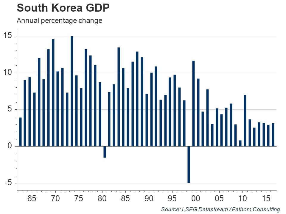 Four decades ago, South Korea was identified as one of the star performers of the global economy. Its stellar performance was a consequence of the Korean government’s drive to promote export-led growth. It escaped the ‘middle-income trap’, which has ensnared so many, close to a decade ago. It provided perhaps the most successful model of all time for emerging markets to follow. But, now the process of rapid industrialisation has run its course, the economy has begun to slow. And the current response of ultra-loose monetary policy is doing more harm than good in South Korea, as across the developed world. Productivity growth has stagnated and real wage growth turned negative earlier this year. Moon Jae-in’s victory in the May presidential election, along with a pickup in global demand, gives grounds for optimism in the short term. But, ultimately, for its economy to return to a higher trend rate of growth, South Korea will need to shift to a new growth model, a feat that has eluded Japan these 25 years. It would mean focusing on promoting ‘fair competition’, stepping up existing corporate restructuring plans, and moving away from ultra-low interest rates, in order to tackle weak productivity.