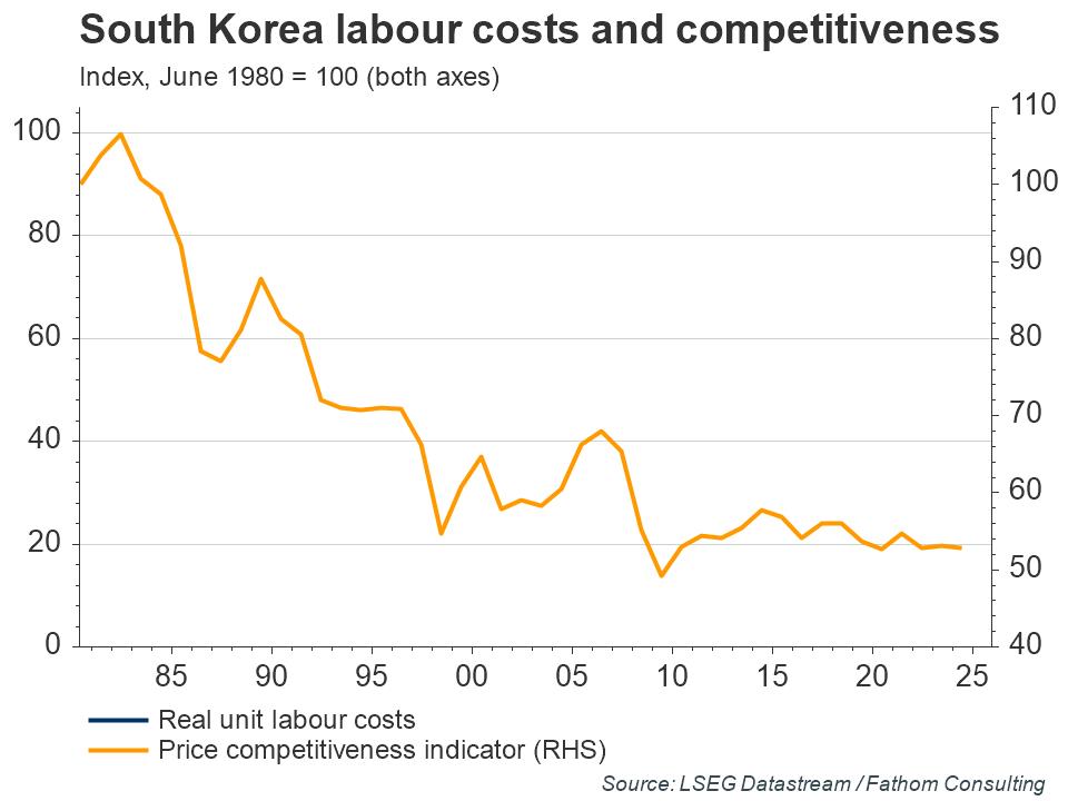 This surge in growth came as a consequence of the Korean government’s drive to promote export-led growth. Tax credits introduced to incentivise efficiency and investment in favoured industries encouraged expenditure on R&D and boosted productivity growth. Until a few years ago this strategy worked. Real unit labour costs — the average cost of labour per unit of output — fell by almost a third between 1980 and 2010. The textbook for developed economies would see this as a constant in the long run, with labour income growing in line with productivity. Falls on the scale achieved by South Korea are only really achievable by countries engaged in rapid industrialisation — the transfer of labour from low-productivity (typically rural) occupations to higher productivity (typically industrial) occupations. Falling real unit labour costs, combined with a significant depreciation in the South Korean won against a basket of currencies, dramatically improved the Asian economy’s international competitiveness by over 50% during this period.