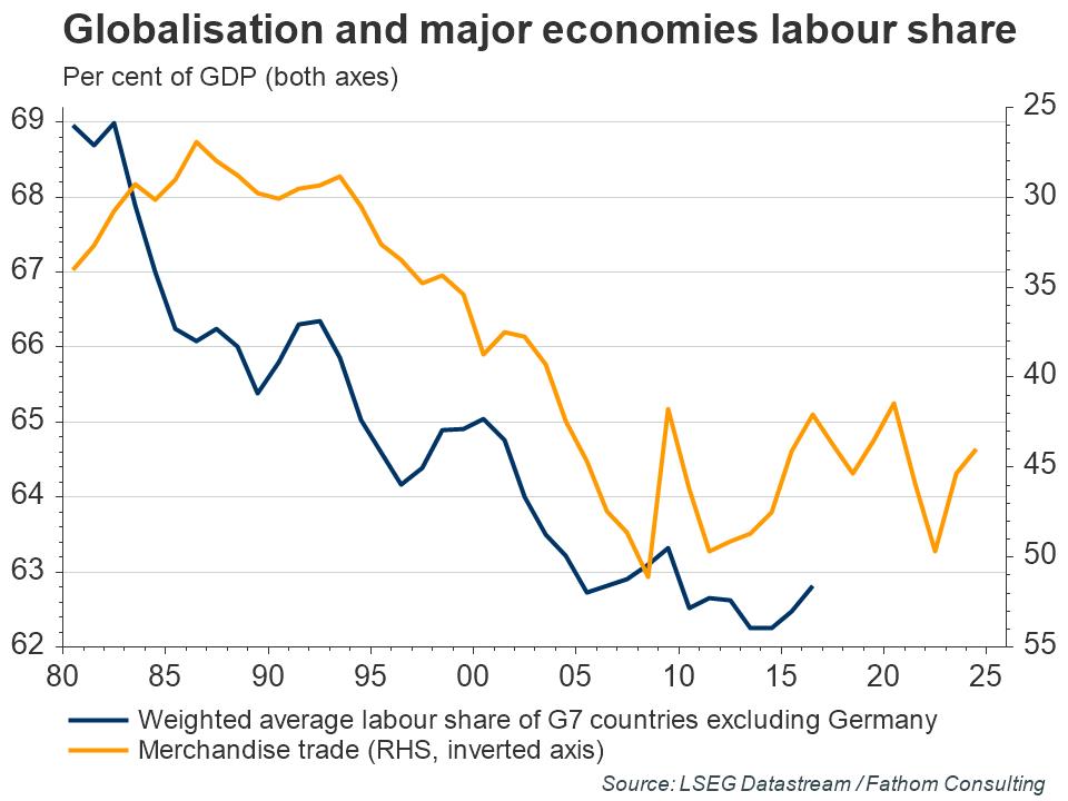 As well as lowering the cost of imported goods, globalisation has put downward pressure on wages in developed economies. Reallocating labour from low-productivity agricultural sectors to higher-productivity manufacturing sectors in emerging economies, has released a pool of cheap labour on to the global market. By enabling firms to either import goods or locate production abroad, globalisation has reduced the wage bargaining power of the average worker. As the next chart shows, the share of the pie accruing to labour via wages, salaries, bonuses and benefits in developed economies has reduced as globalisation has risen.