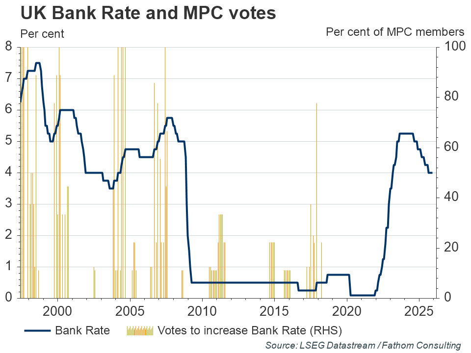Indeed, as confirmed by the Minutes, the latest economic indicators have been mixed and weather poor, causing Bank staff to revise down the estimate of 2018 Q1 GDP growth to 0.3%. That is far lower than the average rate (0.8%) reported at the time of past rate rises. And although Ian McCafferty and Michael Saunders were some of the first to break rank last year, voting for a rate rise with a majority forming behind them several meetings later in November 2017, that is far from always the case. If we are right, and economic activity slows to below the pace that the MPC regards as the ‘speed limit’, the next monetary policy decision in May is likely to be a close call. Contrary to the consensus, our central view is that the MPC will not hike; but if it does, it is unlikely to mark the second of many.