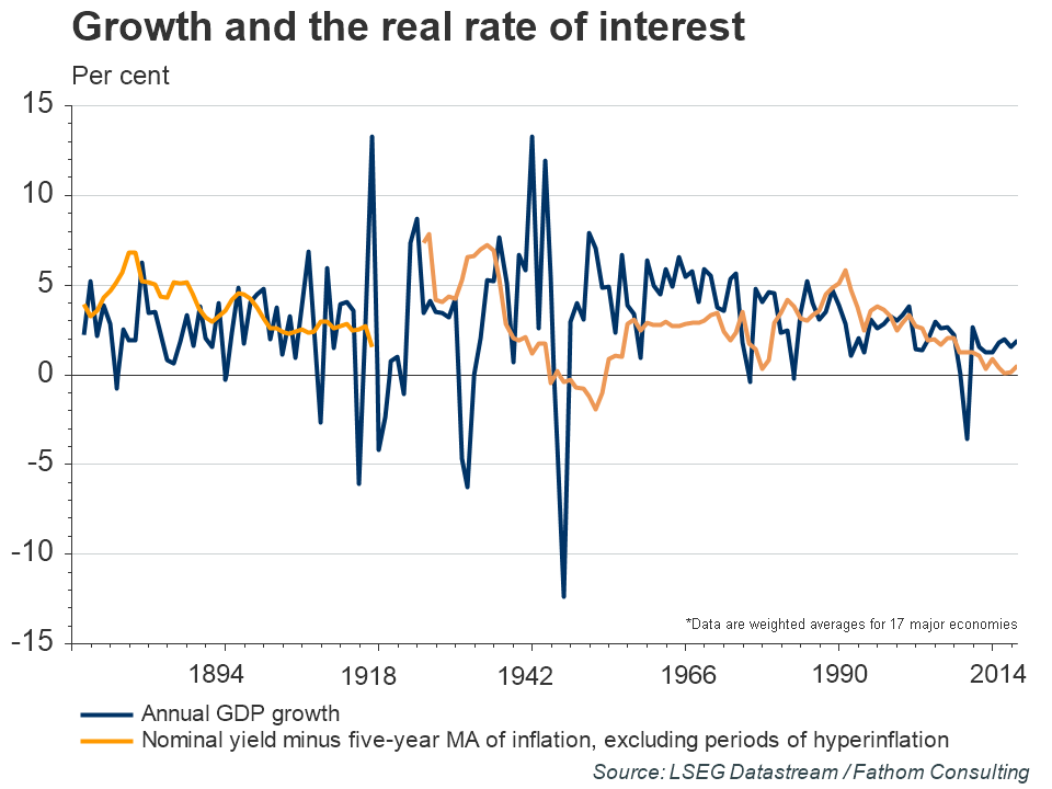 It is Fathom’s view that when the correction materialises it could lead to equity markets shedding as much as 40% of their value. Using the framework of a simple dividend discount model, we reached this figure by asserting that investors’ expectations about the long-run real rate of interest would move into line with investors’ expectations about trend growth across the major economies. The ‘r-g gap’, in short, would close, just as it always had in the past.