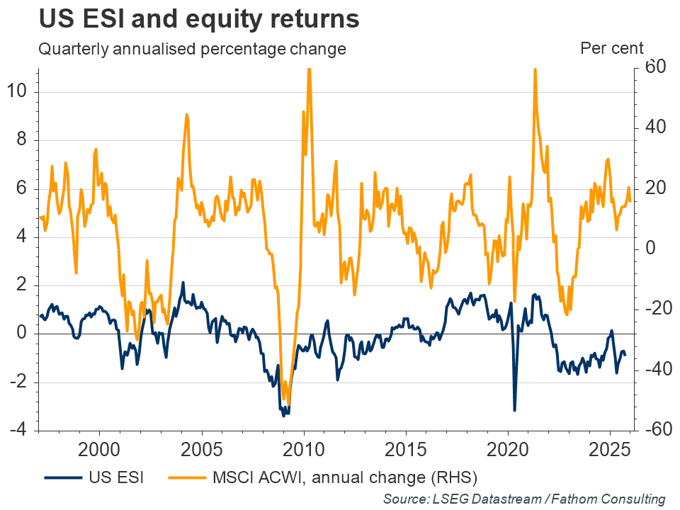 Fathom’s US Economic Sentiment Indicator (ESI) provides a powerful summary of various economic sentiment measures gauging the health of the macroeconomic cycle as well as market gyrations.
