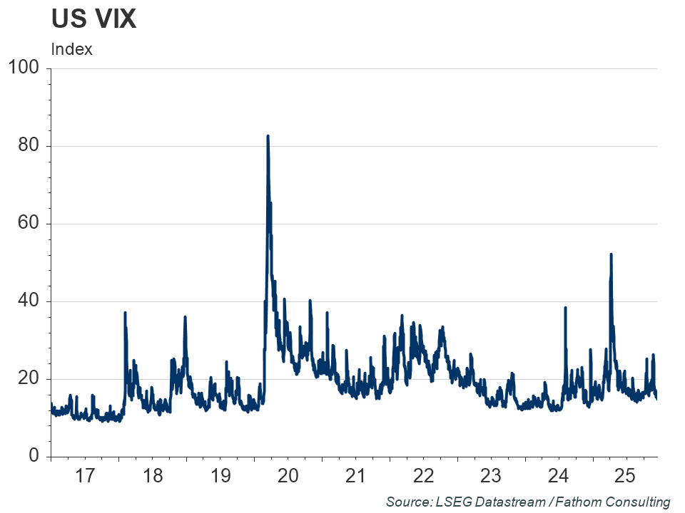 Combining the ESI with market valuations (using the cyclically adjusted price-to-earnings ratio, CAPE for short), provides a road map for the likely path of equity prices over the next 18 months. Over this horizon, we find that equity prices are set to remain positive but volatile, consistent with the current expensive valuations and the strong cyclical macro conditions highlighted by the ESI. In practical terms, we continue to expect more of the same jittery market conditions that have taken hold since February this year.