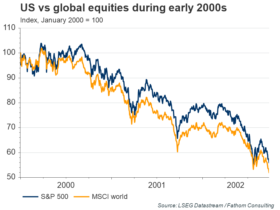 Large equity market swings are nothing new. During the early 2000s, the gap between r and g closed, albeit from a considerably narrower level, as g fell faster than r. A combination of fallout from the Asian crisis of the late 1990s and the dot-com crash in the early 2000s caused a sharp fall in equities of around 40% globally, with the S&P 500 index falling by slightly less. Annual GDP growth in the US fell from 4% in 2000 to 1% in 2001, with the country narrowly avoiding a recession after the Federal Reserve cut interest rates sharply by 475 basis points.