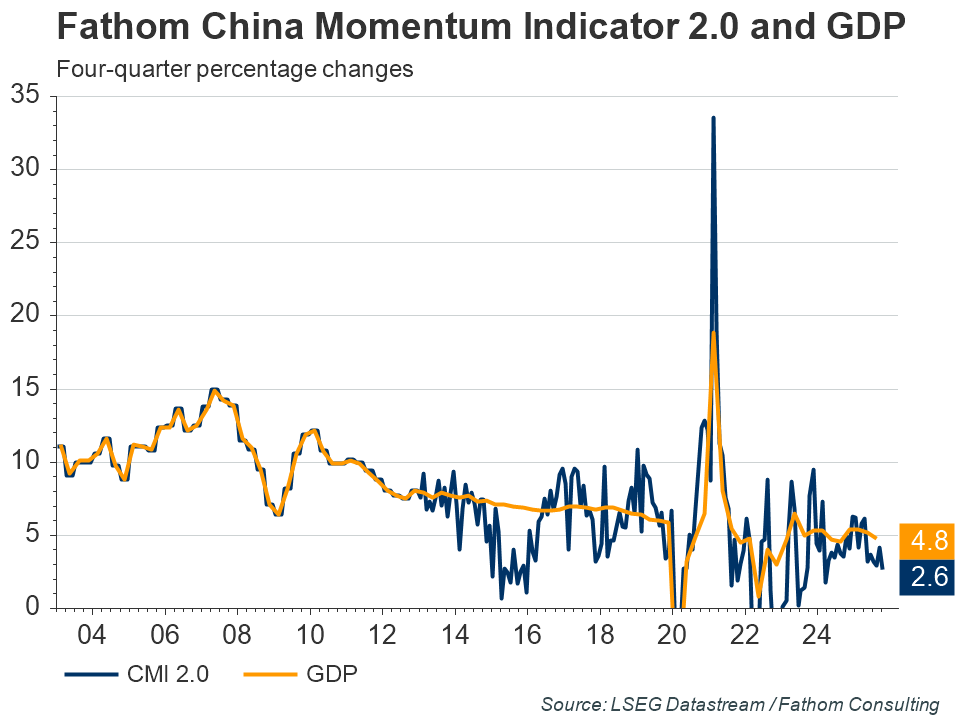 After peaking at a five-year high of 7.0% in July, growth in China slowed to 6.2% in the twelve months to April, according to the latest reading from our China Momentum Indicator 2.0 (CMI 2.0). We see true economic growth in China continuing to weaken, averaging 5.7% in 2018. China’s economy has approached a threshold. International experience suggests that the accumulation of bank credit beyond 250% of GDP stops being effective and starts to damage growth. China passed that point towards the end of 2016. The route to boost aggregate demand cannot, or at least should not, be ever more investment. Fixed investment creates capacity: the flow of investment boosts aggregate demand in the year in which it is undertaken, but it boosts aggregate supply capacity for many years thereafter. In the end, the excess capacity that it generates creates its own problems: negative real returns on investment and non-performing loans in the banking sector. This is where China finds itself today. Investment only makes sense if there is some other source of aggregate demand that will ultimately mop up all that productive capacity. China needs to develop a source of final domestic demand — not investment but consumption — to absorb the growth in productive capacity to which it is already committed. However, China’s policymakers have not yet enacted the reforms which would be necessary to facilitate this shift.