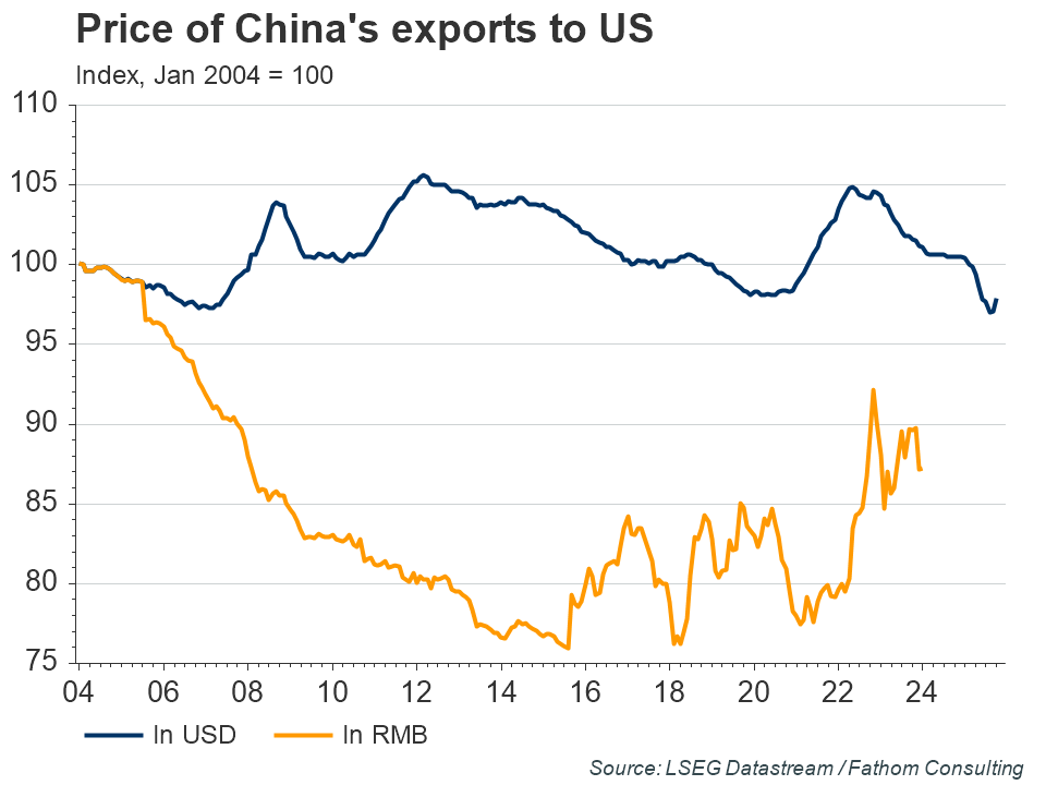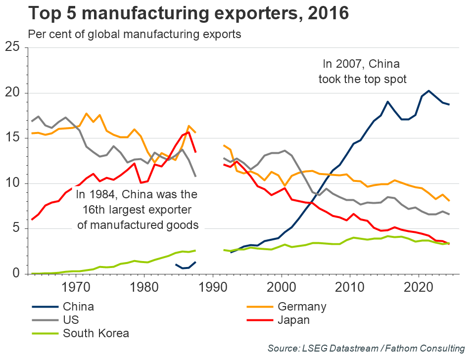 Now, developed economies are running hot again, with output at or above trend and unemployment at or below equilibrium. Normally, the result would be inflation, higher interest rates or a global recession (that is Fathom’s central forecast). But China could prevent that outcome from occurring once again, by redoubling its efforts to increase its export markets by cutting prices even further — either through a weaker currency (which is already happening) or through increased subsidies for exporters (which might be happening). This time around, it will be harder to achieve, since the price-level effects of cheap Chinese labour are already reflected in global prices, and China’s share of global manufacturing exports has already passed the peak that any other industrialising economy has ever achieved. This time, it would mean the dollar price of Chinese exports to the US (and other developed economies) falling sharply, and continuously for the coming few years, not just holding as it did ahead of the great financial crisis.