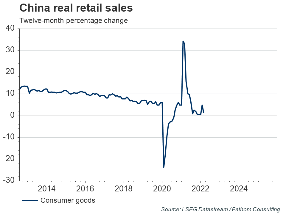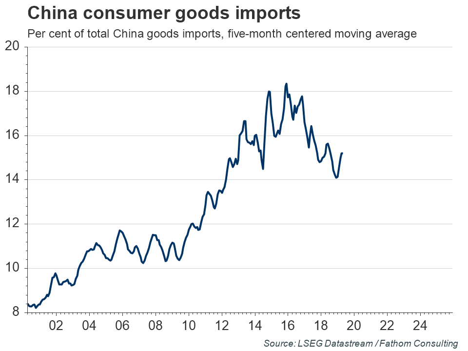This is ‘old-model’ growth: lots of heavy materials being shifted around the economy; lots of commodities being used in infrastructure investment; weak currency supporting exports; consumption squeezed through tighter credit conditions. China abandoned the ‘new model’ (rebalancing towards the consumer) at the end of 2015 after a half-hearted attempt to adopt it resulted in a sharp slowdown. Back then, the share of goods imported in China that were consumer-focused peaked at close to 18% — it is now around 15%. Moreover, the pace of annual growth in real retail sales of consumer goods — one of the ten components of our CMI — reached a record low in July of this year, according to data published by the National Bureau of Statistics of China. To successfully rebalance China’s economy, aggregate demand needs to keep growing at or above its current rate. And, within that, the share of consumer spending in GDP needs to increase dramatically — implying that consumption growth has to run significantly ahead of GDP growth. The tactics currently being deployed by China’s policymakers will not lead to this outcome.
