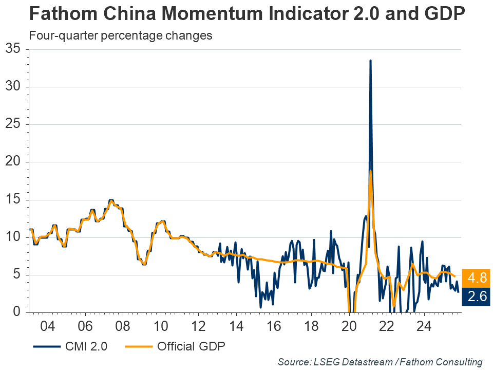 According to Fathom’s China Momentum Indicator (CMI), China’s growth slowed slightly in July to 6.6%, having peaked at the end of last year close to 7%. The slowdown reflects weaker growth in credit and in retail sales, with most of the other components of the CMI holding up.