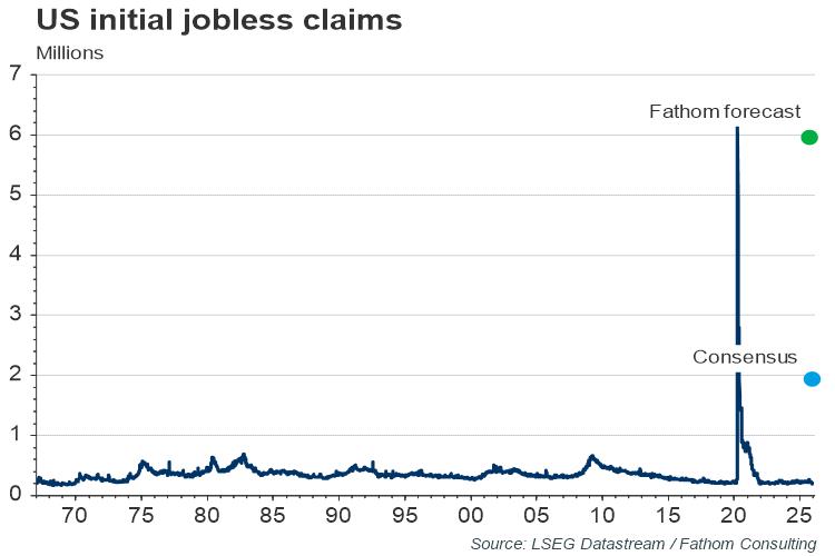 On Thursday, US initial jobless claims shot up to an unprecedented 3.3 million, close to the 3 million predicted by Fathom (vs. 1 million consensus). Markets completely shrugged off the news, rallying for the third consecutive day and leaving the S&P 500 some 18% above the lows recorded at the end of Monday. However, elevated market volatility continues to provide a sobering perspective on the heightened level of uncertainty.