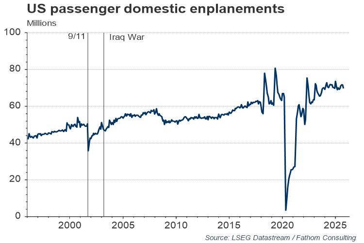 A relaxation of government restrictions is a necessary condition for our V-shaped recovery. However, in the absence of a clear medical breakthrough, it remains to be seen how quickly normal life resumes. If cases do not fall to zero, and there is no effective treatment or vaccine, there remains a high risk that businesses and households will choose not to spend even in the absence of government restrictions. While there is no modern precedent for COVID-19, the experience of 9/11 may be instructive. It took more than a year after those terrorist attacks before US domestic air travel returned to its pre-9/11 peak, as fear remained. The Iraq War appears to have then led to a second wave of decline. Meanwhile, NYC subway ridership also felt the scars of the attacks for some time. That suggests spending may lag the removal of government restrictions as people worry about their health – both economic and physical.